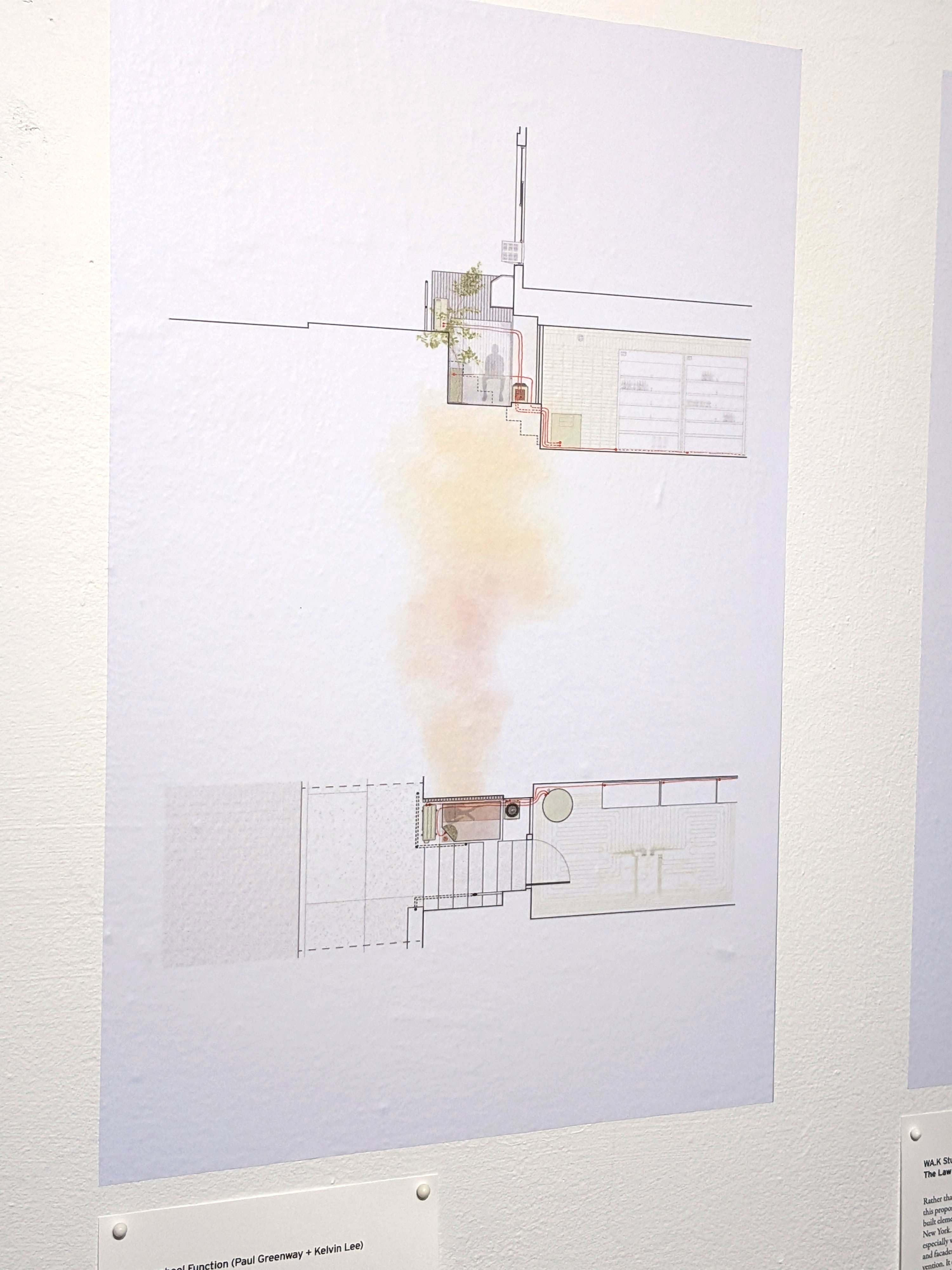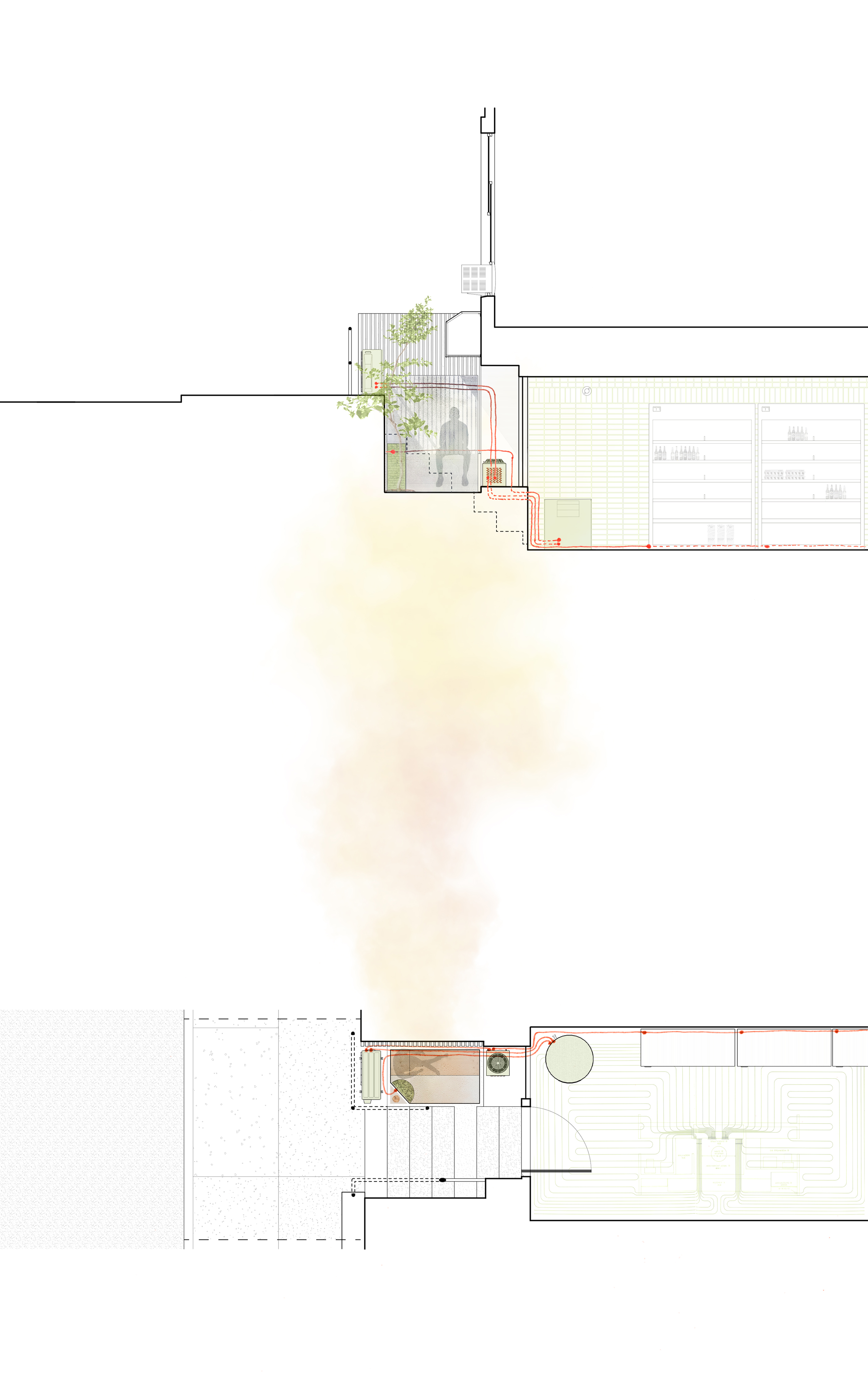 plan and section case study for an exterior sauna that recovers the heat of a market's refrigerators. | in collaboration with Kelvin Lee |